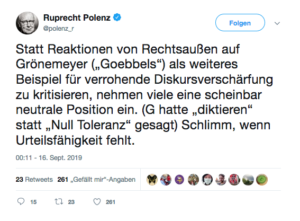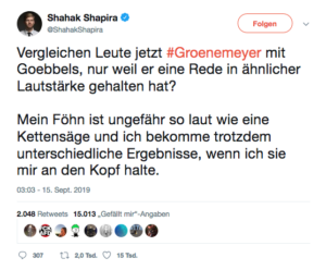 „Vergleichen Leute jetzt #Groenemeyer mit Goebbels, nur weil er eine Rede in ähnlicher Lautstärke gehalten hat? Mein Föhn ist ungefähr so laut wie eine Kettensäge und ich bekomme trotzdem unterschiedliche Ergebnisse, wenn ich sie mir an den Kopf halte.“