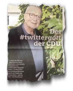 Auch dieser Tweet ist echt. Sogar Ruprecht Polenz selbst ist echt. Auch, dass die FAZ, quatsch, die taz Polenz kürzlich „den Twittergott der CDU“ nannte, ist echt, echt und nochmals echt, verdammt noch mal. Ich erfinde das nicht.