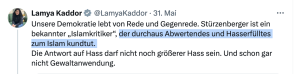 Medien und Politikvertreter ziehen an diesem Tag ihre Rahmen synchron und deckungsgleich. Die Grünen-Bundestagsabgeordnete Lamya Kaddor schreibt auf X: „Stürzenberger ist ein bekannter ‚Islamkritiker‘, der durchaus Abwertendes und Hasserfülltes zum Islam kundtut.“
