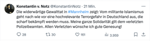 Von dem ebenfalls grünen Parlamentarier Konstantin von Notz heißt es auf X: „Meine ganze Solidarität gilt dem verletzten Polizeibeamten.“ Also ausdrücklich nicht Stürzenberger und den anderen vier Verletzten.