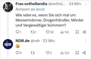 Es gab noch ein kurzes Intermezzo zwischen der Syltgefahr und dem Vorkommnis in Mannheim, das sich noch gar nicht richtig einordnen lässt, solange Sulaiman A. zu seinen Beweggründen schweigt. Eine Gebührenzahlerin hatte auf der Internetseite des Norddeutschen Rundfunks der Redaktion dazu geraten, sich statt um sechs betrunkene Jungerwachsene im „Pony“-Club journalistisch lieber mit Messerangriffen und Gruppenvergewaltigungen zu befassen (letztere gab es 2023 nur in Berlin 111 mal).