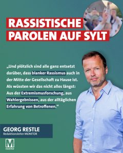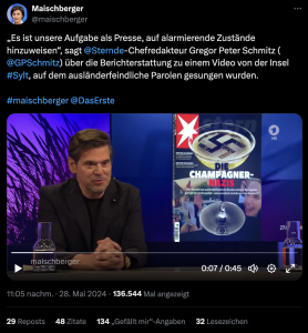 An dem nervösen und gleichzeitig süffisanten Grienen des Stern-Chefredakteurs lässt sich ablesen, dass er selbst nicht eine Sekunde lang an den Blödsinn glaubt, auf Sylt wären echte Nazis erschienen und sein Blatt hätte „alarmierende Zustände in der Gesellschaft“ aufgedeckt. Es stellt noch nicht einmal einen alarmierenden Zustand dar, wenn ein Illustriertenchef die Sylt-Bagage mit dem Satz kurzschließt: „Wir haben uns nach den furchtbaren Verbrechen der Nazizeit darauf geeinigt, dass so etwas nie wieder möglich ist.“ Denn dafür besitzt der mittlerweile an RTL verramschte Titel längst nicht mehr das entsprechende Gewicht.