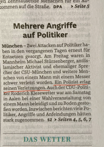 In der Süddeutschen Zeitung schafft es die Redaktion, die Meldung vom Tod des Polizeibeamten ganz rechts unten in der Mitte einer Kurzmeldung auf Seite eins zu verstecken.