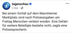 Auch in der Meldung während der Sendung heißt es „Vorfall“, andererseits weiß die Tagesschau-Redaktion sofort, dass es sich bei Stürzenbergers Leuten um eine „islamfeindliche Gruppe“ handelt, die, wie eine Reporterin vor Ort meldet, in Mannheim „vermeintliche Aufklärungsarbeit“ betrieben habe.