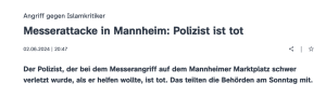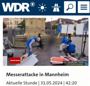 Wenn ein Islamist zum ersten Mal in der Bundesrepublik einen Politiker zu erstechen versucht und einen Polizisten niedermetzelt, dann handelt es sich nach Ansicht des ARD-Senders um kein zeitgeschichtliches Ereignis, der Täter befindet sich auch nicht in einer selbst hergestellten Semiöffentlichkeit, sondern genießt vollsten Persönlichkeitsschutz. Überhaupt: Was heißt hier ‚islamistischer Täter‘? Ein herbeigerufener Experte der ARD warnt vor vorschnellen Schlüssen zu dem Motiv des 25-jährigen Afghanen, der mit dem Messer in der Hand auf einen prominenten Gegner des politischen Islam losstürmt. Bei der Tagesschau heißt das unhistorische Ereignis zunächst einmal „Vorfall“, ein Täter kommt nicht vor, auch keine Nennung des Opfers Michael Stürzenberger, obwohl dessen Name von Anfang an feststeht, und jeder auf dem frei verfügbaren Video sieht, dass der Messerschwinger zuerst auf ihn einsticht.