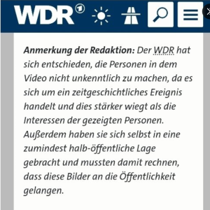 Für den WDR, aber auch die Sächsische Zeitung und die meisten anderen Medien versteht es sich von selbst, den Angreifer vollständig zu verpixeln. Der WDR tut sogar noch mehr, er legt eine Blur-Schicht über die Szenerie.