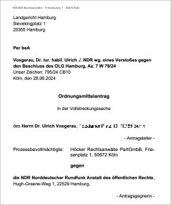 Zur Überraschung des Klägers Ulrich Vosgerau und der Kanzlei Höcker, die ihn vertritt, löschte der ARD-Sender den verbotenen Inhalt allerdings nicht aus dem Netz, sondern ließ ihn dort weiter stehen. Die Kanzlei griff deshalb zu dem relativ seltenen Weg des Ordnungsmittelantrags, um die Anstalt mit der Androhung einer Geldstrafe zur Befolgung des Gerichtsurteils zu bewegen. Der Haken liegt darin, dass die Strafe in der Praxis meist nur bei 5000 Euro liegt, die dann außerdem nicht die Senderleitung aufbringen muss, sondern die Gebührenzahler.