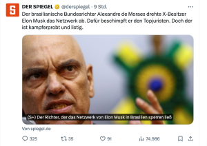 Die Großdemonstration gegen Zensurwillkür in Brasilien findet zu einer Zeit statt, in der die Vertreter des medial-politischen Komplexes in Deutschland gerade engagiert für mehr Meinungsverengung werben – und zwar vornehmlich durch eine Einschränkung oder Abschaltung von X. Die autoritäre Politik der brasilianischen Führung empfinden sie folgerichtig nicht als dystopisch, sondern als interessantes Modell. „Tomorrow was another day/the morning found me miles away“, heißt es in Frank Sinatras „Brazil“ . Politisch liegt Brasilien heute allerdings viel näher an der Bundesrepublik, als viele glauben. Der Spiegel, heute Tränengasgeschütz der Postdemokratie, lobte Moraes unmittelbar nach der X-Sperre als „kampferprobt und listig“.