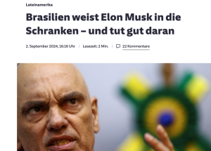 16.09.2024Als jemand, dessen zweite Heimat seit vielen Jahren Brasilien ist, bin ich nun wirklich nicht verwöhnt was die Qualität hiesiger Berichte über das Land angeht. Leider ist der Artikel des von mir sonst hochgeschätzte Herrn Wendt da keine Ausnahme. Er unterscheidet sich durch seine geradezu infantile Kaspertheater Interpretationsfolie (hier der Gute, eben der Kasper Musk, dort der Böse, Lula und das Krokodil de Moraes) nur dadurch von den Medien, die er so kritisiert, dass er die Rollen umgekehrt besetzt als ARD und Co.
