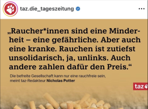 Ganz frisch kommt das Manifest in der taz, dessen Autor darlegt, dass es sich auch beim Rauchen um eine grob unlinke Angelegenheit handelt.