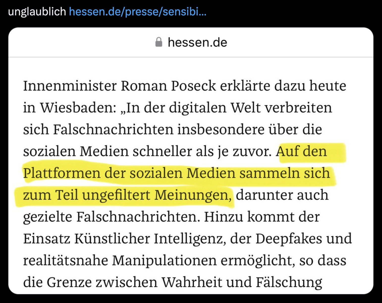 Hessens Innenminister Roman Poseck, wohlgemerkt, ein CDU-Mann, erklärt wortwörtlich „ungefilterte Meinungen“ zur neuen Gesellschaftsbedrohung.