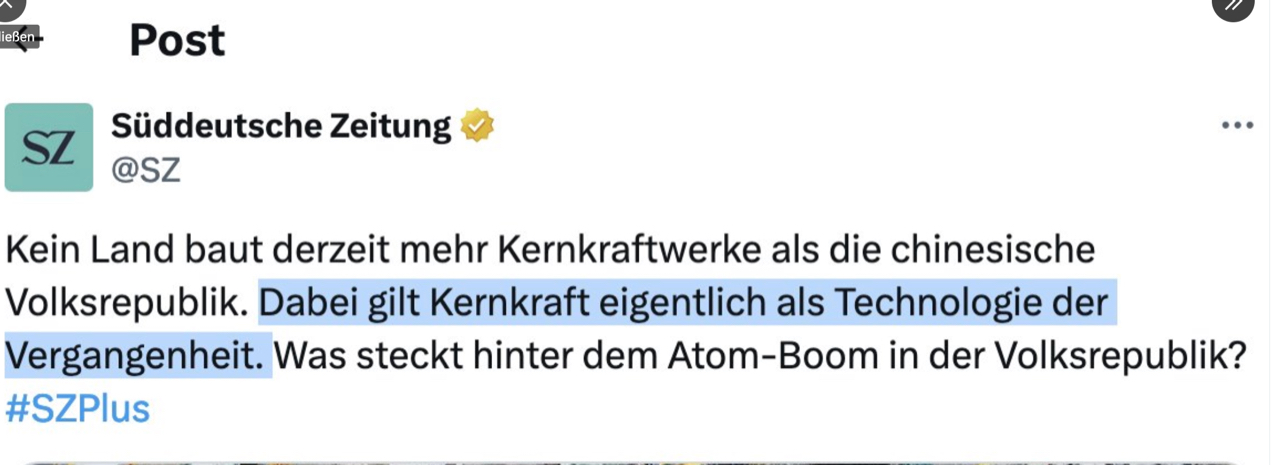 Eine Abrundung erfährt das gutdeutsche Bild von der Welt auf dem Gebiet der Energiewirtschaft. Vor allem, wenn es um Kernkraft geht, erfährt sie eine sehr viel kritischere Betrachtung als der stromerzeugende Fernsehapparat aus Afrika. China, unterrichtete die Süddeutsche ihre Leser, baue die Kernkraft aus – und mahnte streng: „Dabei handelt es sich eigentlich um eine Technologie der Vergangenheit“. Ja, liest man in Peking das Weltblatt aus München nicht?