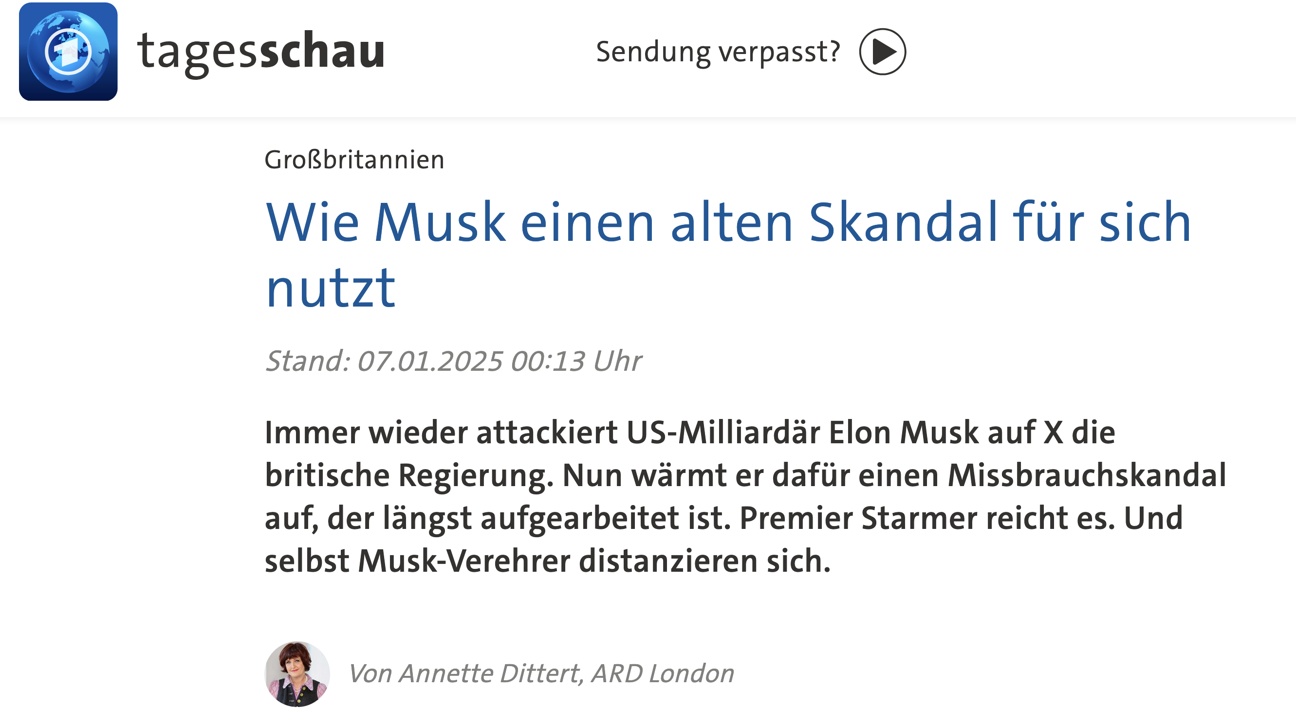 Das etabliert-deutsche Medienbild anderer Staaten zeichnet sein Bild, das sich hauptsächlich aus Weglassungen und Umformungen zusammensetzt. Zu der durch Musk und X befeuerten Debatte über die lange von den Behörden ignorierten grooming gangs in Großbritannien – Gruppen meist pakistanischstämmiger Männer, die Mädchen, manche noch minderjährig, mit Versprechungen, Drogen und Gewalt von sich abhängig machten – erfahren deutsche Verbraucher des öffentlich-rechtlichen Fernsehens, dass Musk erstens im Vergleich dazu das wirkliche Problem darstellt, und zweitens, dass es überhaupt keinen Skandal aufzuklären gibt. Denn das sei schon vor Jahren geschehen: „Wie Musk einen alten Skandal für sich nutzt“, erläutert die ARD: „Nun wärmt er einen Missbrauchsskandal auf, der längst aufgearbeitet ist.“