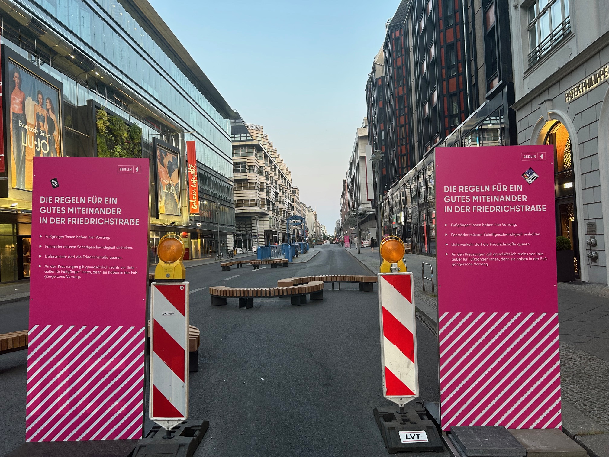 24.05.2025“… Die vorübergehende Vermüllung der Friedrichstraße … unter der grünen Bausenatorin Bettina Jarasch kostete das Land Berlin, also vorwiegend süddeutsche Steuerzahler, inklusive Abbau nach Anwohnerprotesten 2 818 291,70 Euro, wovon 156 200 Euro auf die Holzsitze und -tische entfielen.…”