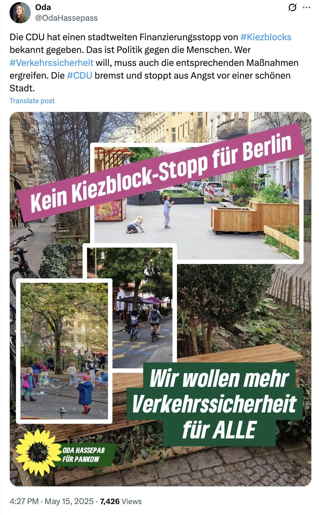 Es würde zur Ehrlichkeit beitragen, wenn in diesem Zusammenhang erwähnt werden würde woher Frau Jarasch kommt. Sie ist keine Berlinerin! Sie ist eine typische zugezogene Westdeutsche. Aus dem provinziellen Süd(west)deutschland. Und von da kommen auch die meisten der Protagonisten, die Berlin zu dem machen, was aus Berlin mittlerweile geworden ist. Ein einziger Spielplatz westdeutscher Provinzdödel, die sich in der steuergeldfinanzierten Welt gegenseitig die Pöstchen zuschieben und die Berlin mit ihrer dümmlichen Provinzromantik belasten. Wenn es sein muss, auch durchaus mit einer für diese Klientel üblichen verlogenen Hinterhältigkeit. Siehe die Verleumdung des ostdeutschen (Ostberliner) Grünenabgeordneten Gelbhaar durch eine (süd)westdeutsche Verleumdungskampagne im RBB.