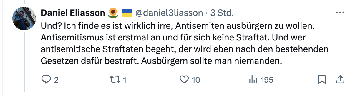 Worauf ihn sein Parteifreund Daniel Eliasson, Vizefraktionschef der Grünen in der Bezirksverordnetenversammlung Steglitz-Zehlendorf, auf die neuen Zeiten hin- und zurechtwies: Selbst da, wo es möglich sei, dürfe niemand wegen Antisemitismus hinausgeworfen werden, Antisemitismus sei schließlich keine Straftat. Das trifft zu, allerdings herrscht auch keine akute Knappheit an Leuten mit antisemitischen Ansichten oder Vorlieben für IS-Flaggen und die Hamas, die der Staat wegen ihres deutschen Passes nicht mehr loswird.