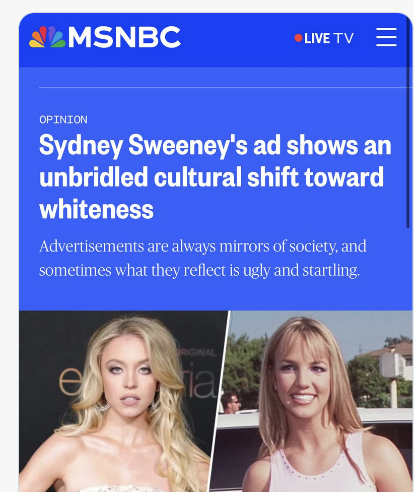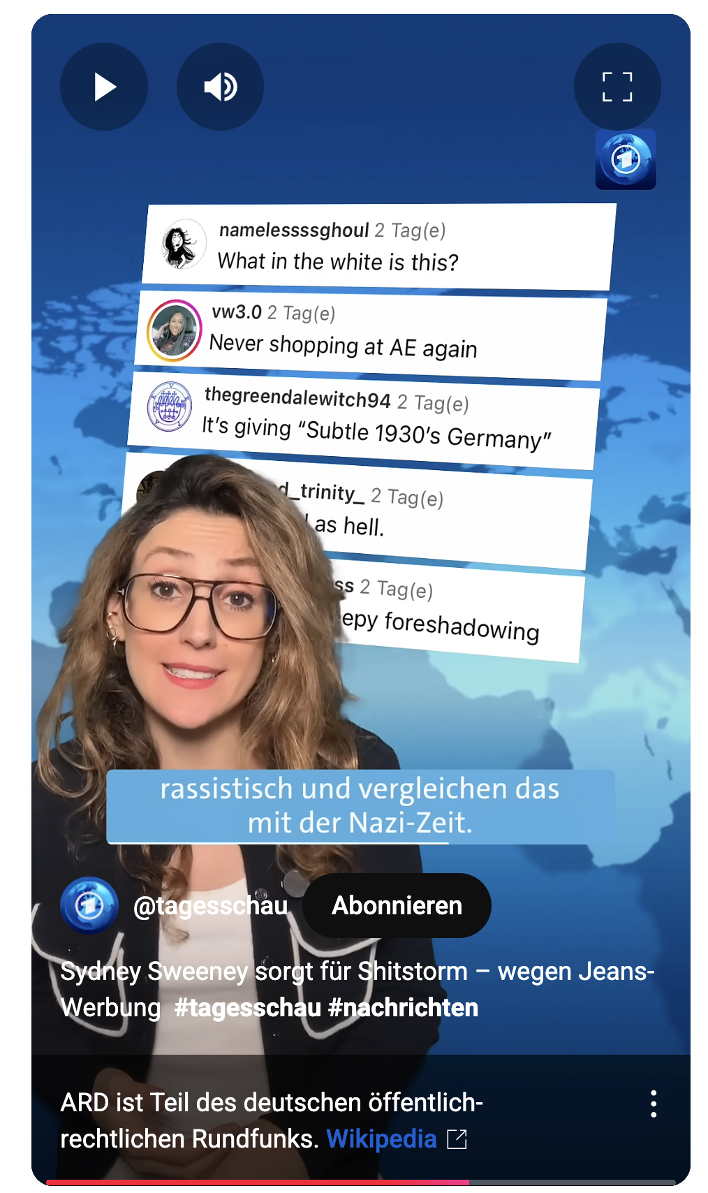 Der ersten Welle auf TikTok, Instagram und X folgte die in den vergangenen Jahren gut eingespielte Welle zwei: Medien kehren das Material zusammen und versintern es zu Beiträgen wie „Große Empörung über XX“ /„Der unterschwellige Rassismus von XX“/„Die rechten Codes im Spot von XX“ und so weiter, natürlich mit den entsprechenden Fragen an das Unternehmen, welche Konsequenzen man dort zu ziehen gedenkt. Der Sender MSNBC, hier wieder als Beispiel für viele andere dokumentiert, fand das, wofür die Jeanswerbung seiner Meinung nach steht, „ugly and startling“, hässlich und alarmierend.