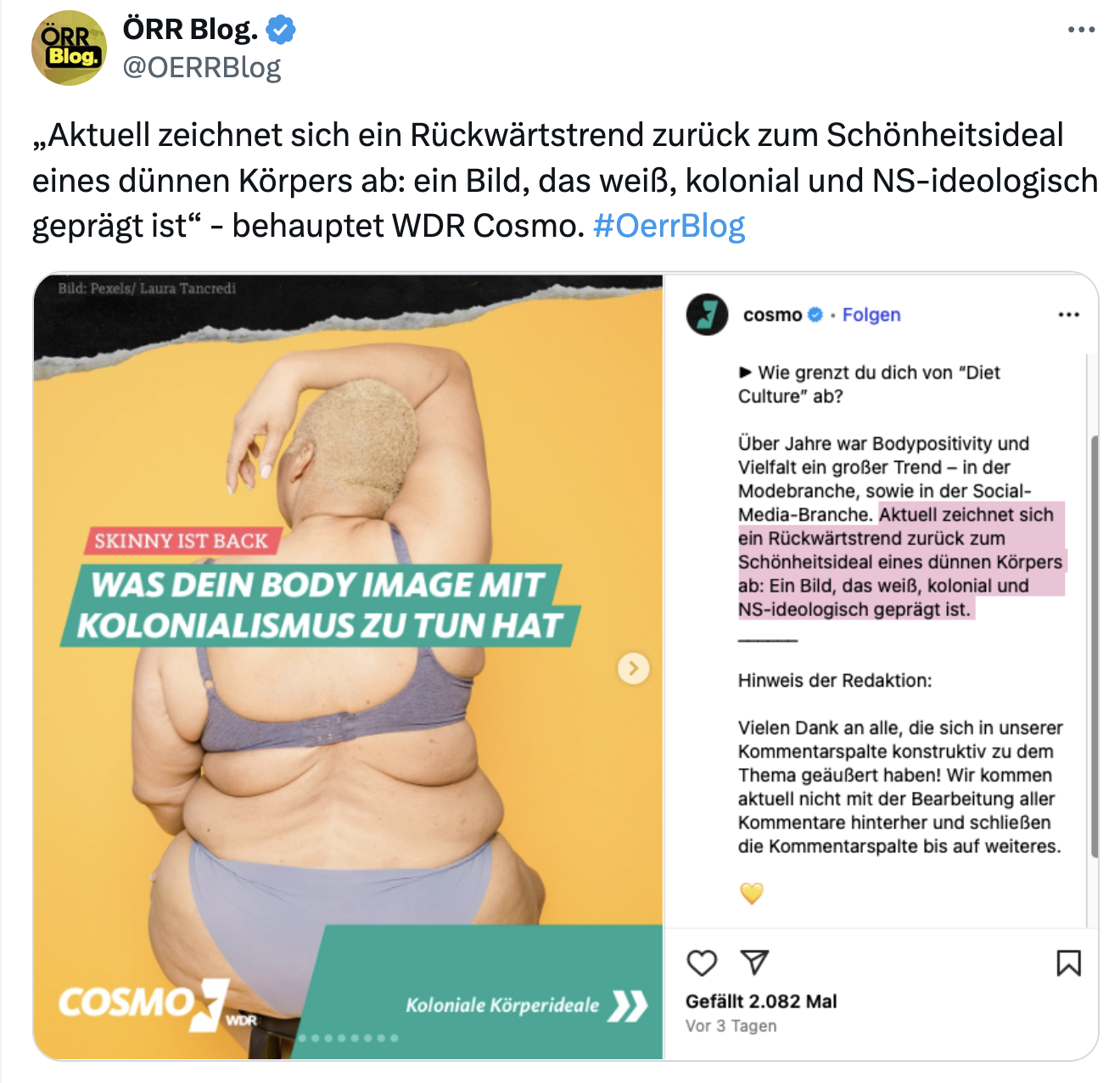 WDR Cosmo informiert sein Publikum über das neue Körperideal, für das dreierlei gelte: „weiß, kolonialistisch und NS-ideologisch“.