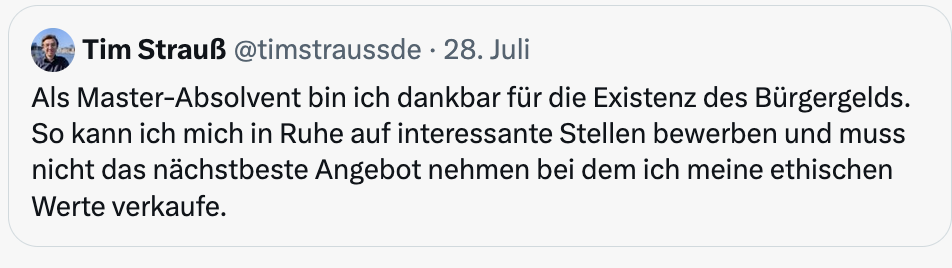 Wie die Titanic verfügt auch das lecke Gefährt unter der Flagge des goldenen Dreiecks über mehrere Ebenen. Weiter unten auf den billigeren Plätzen stehen die Chancen auf ein Weiterso naturgemäß deutlich schlechter. Und dort geht es noch nicht einmal um Mandate, sondern um viel bescheidenere Hoffnungen. Kürzlich teilte ein frisch gebackener Absolvent der Politikwissenschaften auf X seine Zufriedenheit über das Bürgergeld mit, das es ihm derzeit noch ermöglicht, den Tücken des Arbeitsmarkts zu entgehen.