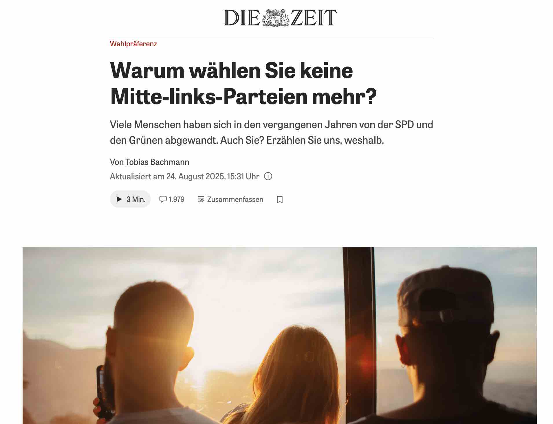 Die Zeit fragt übrigens in einem anderen Betrag: „Warum wählen Sie keine Mitte-links-Parteien mehr?“ Auf dem Illustrationsfoto dazu schauen mehrere Leute in einen Sonnenuntergang.
