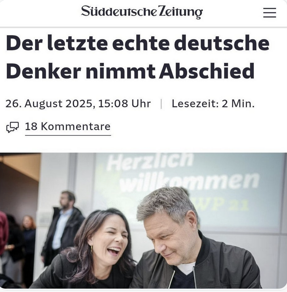 Mit einem etwas zweischneidigen Erfolg druckte die Süddeutsche noch einen Text mit der Überschrift: „Der letzte echte deutsche Denker nimmt Abschied“. Dabei handelte es sich um eine Glosse. Nur lag die eben für sehr, sehr viele deutsche Mediennutzer, die nur die Überschrift lesen und nicht auch noch hinter die SZ-Bezahlschranke steigen, deutlich neben ihrem Erwartungsraum.