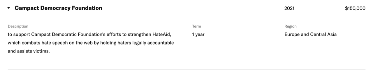 Im Spendenverzeichnis der Open Society Foundation heißt es, das Geld diene dazu, „HateAid zu stärken, die Hasssprache im Netz dadurch bekämpft, dass sie Hasser rechtlich zur Verantwortung zieht und Opfer unterstützt“ („to strengthen HateAid, which combats hate speech on the web by holding haters legally accountable and assists victims“). Hier zeigt sich schon ein grundsätzliches Problem, das die gesamte Selbstdarstellung des Campact-Hensel-HateAid-Komplexes und seiner Unterstützer durchzieht: Das deutsche Straf- und Zivilrecht kennt keinen Tatbestand der „Hasssprache“, folglich auch keine Täterkategorie „Hasser“. Genau darin allerdings, „Hass“ und „digitale Gewalt“ als pseudorechtliche Kategorien zu etablieren – vorausgesetzt, die entsprechenden Meinungsäußerungen stammen nicht von linker Seite –, besteht die Haupttätigkeit von HateAid. Dafür fanden von Hodenberg, Ballon und ihre Truppe von Anfang an eifrige Unterstützer, Geld- und Auftraggeber in der Politik, vor allem in Gestalt der damaligen Bundesjustizministerin Christine Lambrecht, aber auch durch Innenministerin Nancy Faeser, die bekanntlich Bürgern drohte: „Wer Hass und Hetze verbreitet, bekommt es mit der Polizei zu tun.“