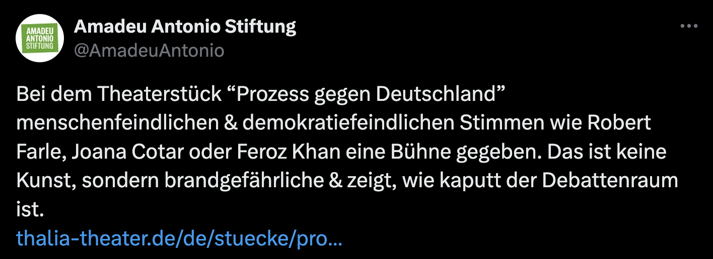 „Das ist keine Kunst, sondern brandgefährlich & zeigt, wie kaputt der Debattenraum ist“, schrieb die AAS, weil sie korrekt erkannte, dass hier eine echte Debatte drohte. Der Gründerin des Vereins „Free Speech Aid“, Joana Cotar, und anderen Teilnehmern warf die Stiftung ohne jeden Beleg vor, zu nicht näher definierten „menschenfeindlichen & demokratiefeindlichen Stimmen“ zu gehören.
