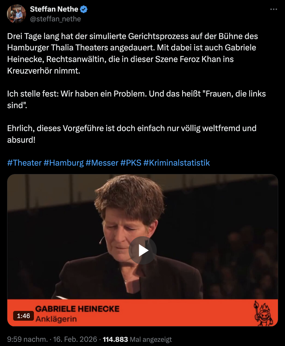 Zu den Zeugen der Verteidigung gehörte der AfD-nahe Influencer Feroz Khan, der unter anderem die Zahl von „29.000 Messerdelikten“ im Jahr 2024 nannte. Die Rechtsanwältin Gabriele Heinecke in der Rolle der Anklägerin fragte ihn, woher er diese Zahl habe. Khan: „Über Polizeiliche Kriminalstatistik ist das nachvollziehbar. Die wird vom BKA herausgegeben.“ Worauf Heinecke erwiderte: „Soll ich Ihnen was sagen? Das, was Sie hier bisher gesagt haben, ist, Entschuldigung, nicht bös gemeint, totaler Bullshit.“ Ob er sich denn „diese Auswertung“ überhaupt angeschaut habe?
