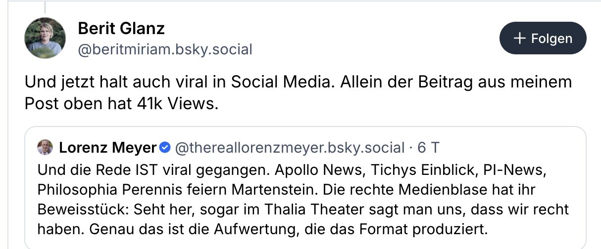 Auf der Plattform „Bluesky“, dem digitalen Forum für Thaliatheaterbesucher aus aller Welt, erkannte jemand sehr schnell den eigentlichen Kern des Übels: Wenn echtes Pro und Contra in den Diskurs- Kulturbetrieb einzieht, dann steht der Feind schon im Inneren der Festung.