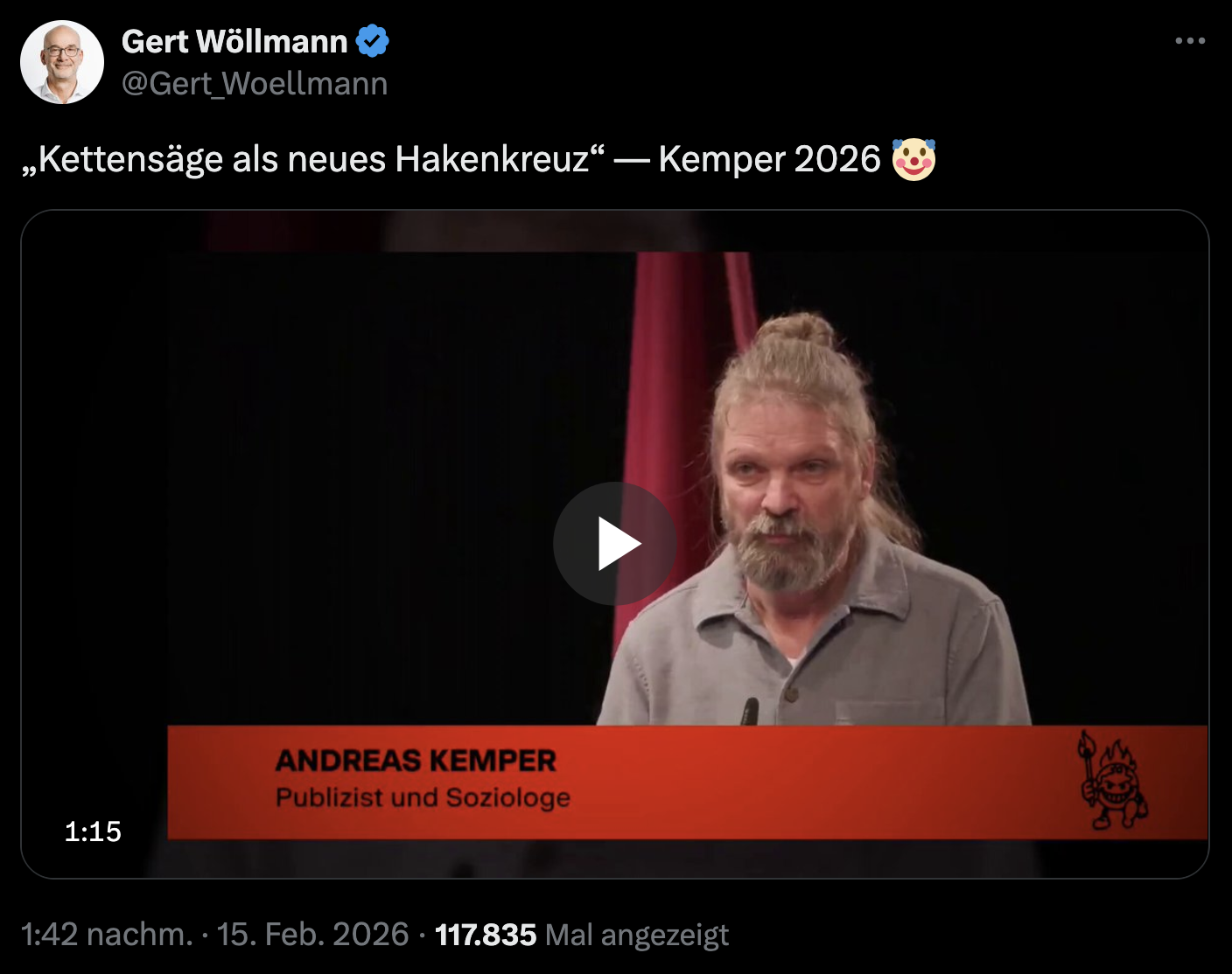 „Es droht“, so Kemper, „nicht nur das Hakenkreuz, sondern auch die Kettensäge als das neue Hakenkreuz.“ Also in jedem Fall das Hakenkreuz. Zu dem Tech-Faschistenimperium zählt Kemper auch ausdrücklich den Software-Hersteller Palantir und damit dessen Chef Alex Karp, Sohn eines jüdischen Vaters und einer farbigen Mutter. Als ein Vertreter der Verteidigung (Frédéric Schwilden) Kemper nach dessen wissenschaftlicher Kompetenz fragte, erhielt er zur Antwort, das interessiere ihn nicht. Ähnlich wie die AAS finanziert sich Kemper zu einem erheblichen Teil über öffentliches Geld – mal von der Heinrich-Böll-Stiftung, mal von der Friedrich-Ebert-Stiftung, auch von der Stadt Essen für ein juristisch wertloses Gutachten, Kostenpunkt 3900 Euro. Als Autor schreibt er unter anderem für die erwähnte Amadeu Antonio Stiftung. Eine bündige und sogar authentische Definition von Faschismus lautet in der Welt von Kemper: eine Politik, die ihm und ähnlichen Leuten den Zugang zu Steuermitteln verstopfen würde. n diese großzügige Begriffsbestimmung passt die AfD allemal; vor der Bundestagswahl 2025 sogar die Union.