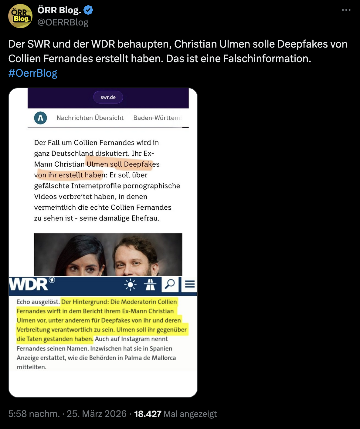 Worin bestehen nun überhaupt die Anschuldigungen, mit denen Fernandes die Spiegel-Titelgeschichte füllte? Sie erklärt, ihr Ex-Partner Ulmen habe täuschend echt aussehende Fake-Profile von ihr auf Social-Media-Kanälen erstellt, über die er Männer kontaktierte, mit denen er dann, indem er sich als Fernandes ausgab, sexuelle Gespräche geführt und erotische Videos verschickt haben soll, auf denen eine Person Fernandes stark ähnele. Sollte das zutreffen, dann handelt es sich um ein bizarres und bösartiges Verhalten – aber mit Sicherheit um kein Phänomen, das, wie die Grünen-Fraktionschefin Katharina Dröge behauptete, Millionen Frauen betrifft. Dass er von ihr pornographische „Deepfakes“ erstellt habe, wirft Collien Fernandes Ulmen ausdrücklich nicht vor. Diese „Deepfakes“ gebe es zwar, erklärte sie, sie würden aber von bisher Unbekannten stammen. Das hinderte allerdings die ARD-Anstalten WDR und SWR nicht daran, die Behauptung zu verbreiten, Ulmen stecke hinter den ominösen Fernandes-„Deepfakes“.