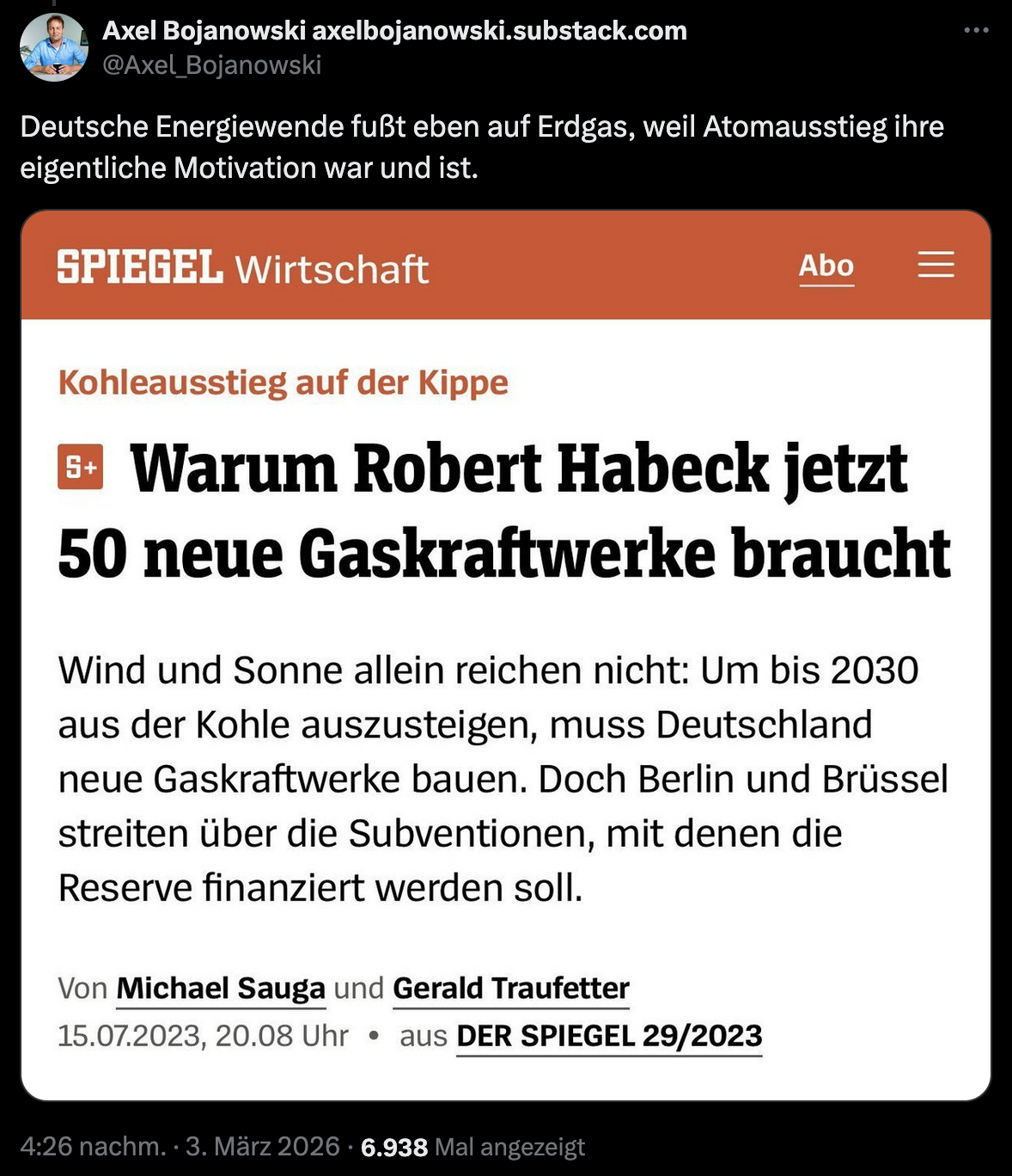 Was die angeblich von der aktuellen Bundesregierung verschuldete Abhängigkeit Deutschlands von fossilen Importen betrifft: Wer durch den propagandistischen Nebel schaut, der erkennt schnell, dass Wirtschaftsministerin Katharina Reiche einfach nur die schon von Habeck begonnene Planung für Gaskraftwerke fortsetzt, die einspringen müssen, wenn die Sonne nicht scheint und der Wind nicht weht.
