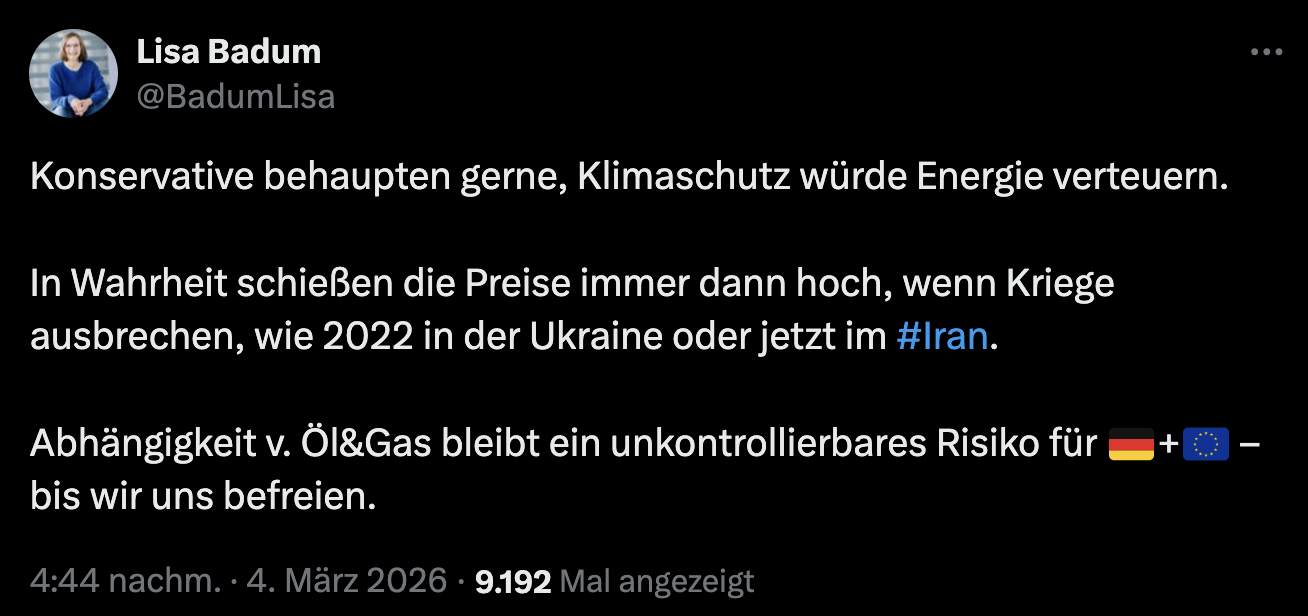 Die grüne Bundestagsabgeordnete Lisa Badum versucht wie auch andere Grünenpolitiker, den Krieg gegen den Iran in die Kampagne gegen Reiche und für Solar- und Windenergie einzubauen, indem sie die Behauptung aufstellt, nicht die Energiepolitik würde die Energie verteuern, sondern „Kriege“ und die „Abhängigkeit von fossilen Energien“, die Habecks Nachfolgerin verstärken wolle.